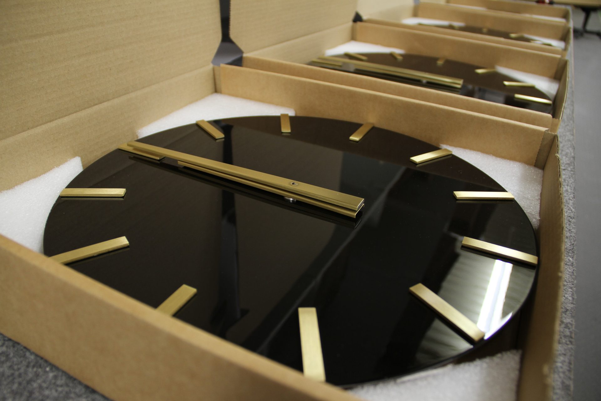 The clock is Decorative type C in brass but with a different color and gloss. The signs are in brass plate with milled characters. The clock is synchronized by our master clock WDP-WT which enables displaying several time zones.