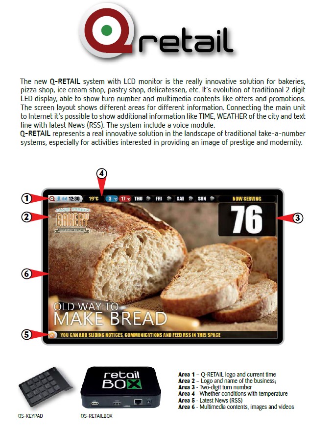 כך מה שפעם היה "סתם" ניהול תורים הופך גם לכלי פרסום ושיווק יעיל שיכול לבדר את דחיפת הלקוחות לעידוד מיידי ברכישה. אתה צריך להבדיל את הקוד? אל תפחד, Q-Retail תומך בעד שני שירותים שונים והמספור ניתן לניהול באמצעות קונסולת Q-Retail (Windows Virtual Console), QS-KEYPAD (לוח המקשים האלחוטי) או ה- QS-WCONS החדש (מפעיל ספסל WiFi של קונסולות).